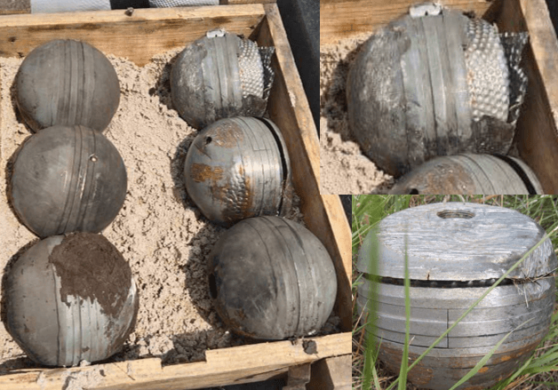 Some of the submunitions are damaged, showing the internal pre-formed fragmentation assembly