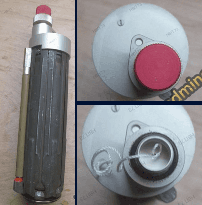 The red cap is unscrewed to reveal a string. When pulled, this releases a spring-loaded striker to ignite the pyrotechnic train