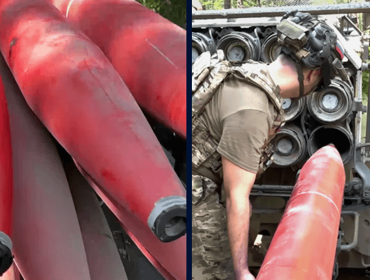 Two videos have appeared, showing Ukrainian 220 mm Uragan rockets fitted with red warheads, designed to dispense leaflets
